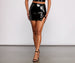 Something about this mini skirt will make you want to channel your edgy side. The skirt features a high rise waist. side slit. and a mini length silhouette. The skirt is composed of a faux patent leather fabric that offers a form hugging fit. Complete your look with the matching crop top.Â