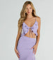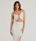 Make major flirty moves and create an enticing aura in this ruffled tie-front crop top! Designed with a stretchy smooth knit fabric. it features a sultry V-neckline with a tie-front design. ruffled hems for that girly flair. spaghetti straps. and an asymmetric cropped hem. Style with the matching midi skirt for a girl's night out!