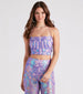 This shimmery sequin crop top will have you radiating glitzy vibes! It features a square neckline. halter spaghetti straps. a fitted. cropped hem. and sequin embroidery in a stunning scroll design. Style with the matching flare pants and clear heels for your next girl's night out!