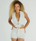 Perfect for every day. you'll love the minimal vibes of this linen vest! The sleeveless lapel collar and tie-front closure add a modern aesthetic to any outfit. while the cropped hem finishes the chic look. Style with the matching pants.