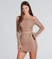 Showcase your bling in this mesh crop top to attract all the attention! It features fitted long sleeves with flared slit cuffs. a cowl neckline. a cropped hem. and all-over faux pearl and rhinestone embellishments for a glam allure. The sheer mesh fabric includes a knit lining. Complete your glitzy look for your a birthday or holiday party with the matching mini skirt.