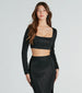 Bring the glitz and glamour as you party past midnight in this rhinestone crop top! It features a square neckline. long fitted sleeves. a fitted cropped hem. and a front embellished design of gleaming mini rhinestones. The metallic lurex threading in the sweater knit fabric will give off a stunning shine. Complete your party look with the matching maxi skirt and stiletto heels.