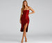 Keep it ravishing in a ruffled midi dress that brings the charm! The dress features a sleeveless square neckline. spaghetti straps that cross at the back. a high side slit with a ruffled trim. and a midi-length silhouette. The dress is composed of a lined smooth knit fabric with a metallic sheen. Complete the look with a faux fur wrap and mules.