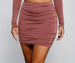 Keep it sleek and stunning with a mini skirt that makes a stylish statement. The mini skirt features an elastic high-rise waist. ruched side seams. and a mini-length silhouette. The skirt is composed of a lined smooth knit fabric that offers a form-hugging fit with a moderate stretch. Complete look with the matching crop top and mules.Â