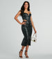 Showcase your sultry side in this figure-flaunting faux leather midi skirt! Designed with a sleek embossed snake print on the faux leather fabric. this skirt brings the chic allure. The mid-length skirt features a high waist with a back zipper closure. a high-cut back slit accent for a sexy detail. and a form-hugging fit to create that snatched silhouette. Complete your going-out look with the matching bustier and a pair of strappy stilettos!