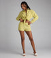 Activate summer mode with these lightweight cotton shorts featuring a high-rise elasticized waist. dual front pockets. and a fitted silhouette. Style with the matching bra top and button-down top for an effortlessly chic look.