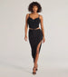A high-rise maxi skirt features an asymmetrical high front slit and form-hugging silhouette. Perfect for weekend plans.