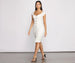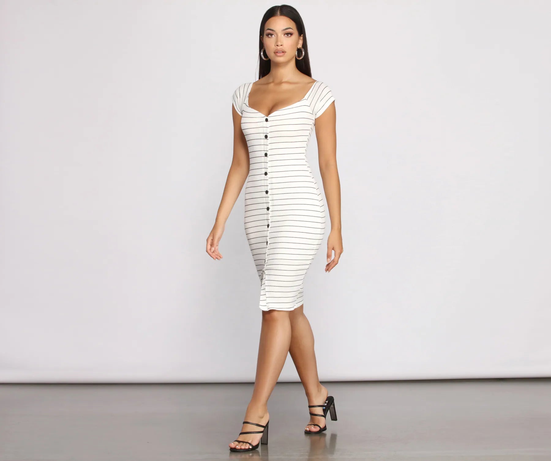 Keep it stunning in a striped dress that wows. Step out for brunch in this midi dress that features an off the shoulder neckline with a sweetheart bust. short sleeves. a button-down front. and narrow horizontal stripes. Complete your look with strappy mules and sleek hoops.
