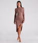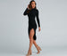 You'll casually slay in this basic chic midi dress with elevated details. It features a mock neckline. long fitted sleeves. a curve-hugging silhouette. and a front slit with ruching. Style this dress with trendy clear mules.