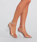These metallic block heels are a clear favorite! They feature a square toe. a PVC clear foot strap. a clear lucite block heel. and an adjustable PVC clear ankle strap with buckle closure. Complete the look with a dressy coat for a black tie party!