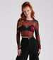 This mesh crop top never kisses and tells! Create a flirtatious vibe wearing this top featuring fitted long sleeves. a crew neck. and a cropped hem on sheer mesh fabric with plenty of stretch. Complete the look in wide-leg pants.