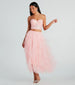 Bring a little drama to your look with this ruffled tulle midi skirt that will add a chic flair. It features a high-rise elastic banded waist for comfortable wear. a midi-length hem with a flowy. A-line silhouette. and a sheer ruffled tulle design over a knit lining. Style with a corset top and mules.