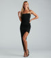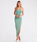 A real showstopper of a maxi dress! Flaunt your best self in this sleeveless dress featuring a square neckline. spaghetti straps. an open lace-up back design. a ruched side seam. and a bodycon silhouette with a flattering high side asymmetrical slit on sleek knit fabric. Complete the look in block heels for a dinner date.