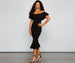 Make a dramatic entrance with a midi dress that is perfect for your cocktail event. The dress features a ruffled off-the-shoulder neckline a bodycon fit. and a midi length silhouette with a ruffled hem. The dress is composed of a crepe fabric that offers a form hugging fit with a moderate stretch. Complete look with stiletto heels and statement earrings.