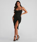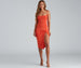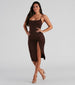 Bring a stylish twist to your look with a sleek midi dress that slays! The dress features a sleeveless scoop neckline. spaghetti straps. a high side slit with a twist knot accent. and a midi-length silhouette. The dress is composed of a smooth knit fabric that offers a form hugging fit with a moderate stretch. Complete look with clear PVC heels and a faux leather clutch.
