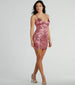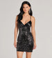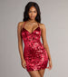 Gorgeous sequins shine on the Abby satin party dress with daring sultry details sure to turn heads at bachelorettes or parties! Be a showstopper in her sexy plunge V-neckline and mini-length bodycon silhouette that enhances your curves. while the padded bra cups provide support. The lace-up back adds a touch of sophistication. complementing the satin fabric and intricate sequin scroll pattern. Complete the look in platform heels. jewelry. and a clutch for an unforgettable night!