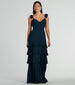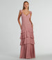 Create a simply stunning look in the Adalee flutter strap ruffled chiffon formal dress! Crafted with an airy sheer chiffon fabric with a full-length knit lining for coverage. this long dress evokes an effortless whimsical vibe for weddings. dances. or any formal occasion. Her bodice is shaped with a V-neckline and adjustable spaghetti straps with dainty flutter accents for a feminine look. Her fitted high waist leads to a gorgeous tiered ruffled design for added volume and chic movement on the floor-sweeping A-line silhouette. Complete your look with rhinestone duster earrings for a pretty sparkle.