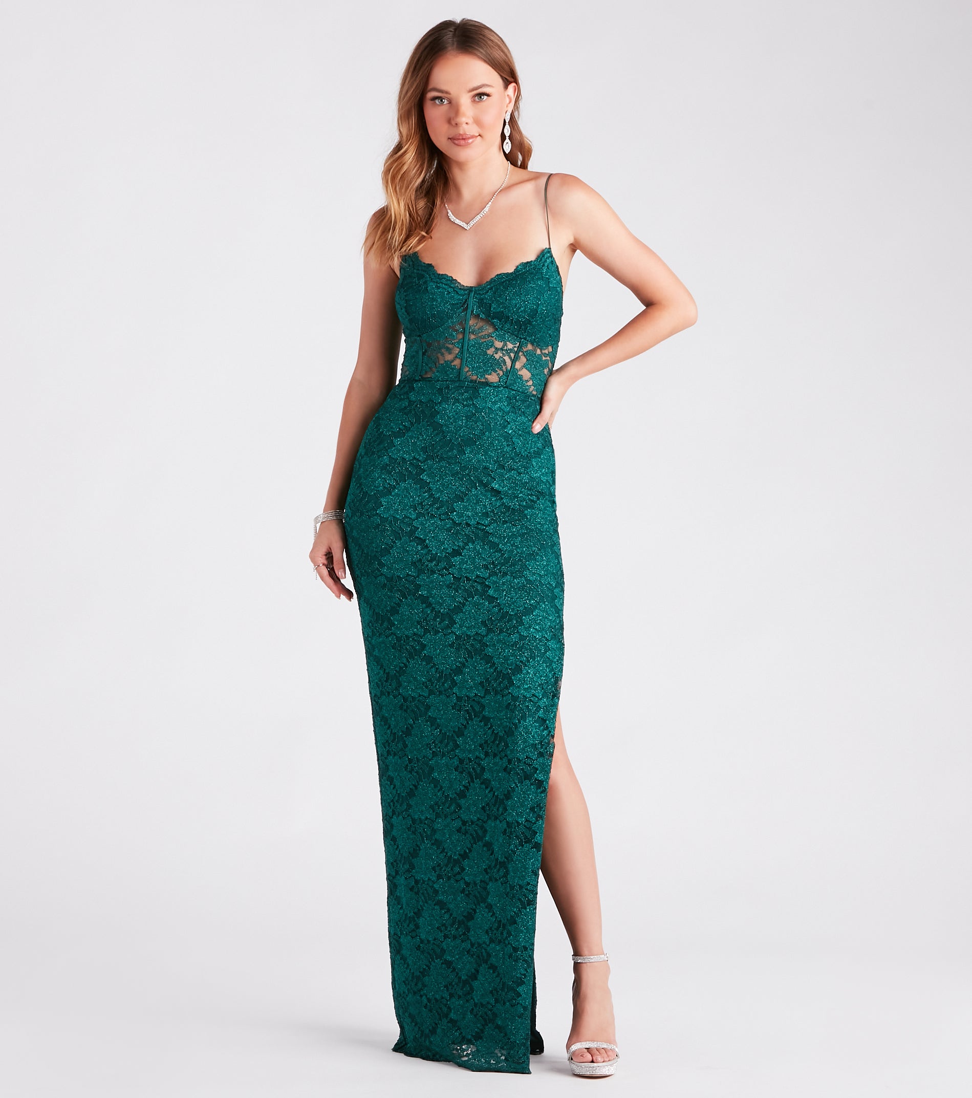 Light up the room in the lovely Adelaide formal dress showcasing sparkling glitter to enchant at banquets or galas! She features a sleeveless scalloped V-neckline. sleek bungee spaghetti straps. a sheer bodice with satin trim. and a hip-hugging slim silhouette with a sultry side slit and long hem. The formal long dress is composed of a glitter lace fabric with a stretchy knit lining. Complete the look with a clutch and platform heels.