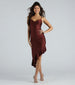 Capture every heart on the dance floor in this sleeveless midi dress perfect for parties and dressy celebrations! The midi dress features a V-neckline. spaghetti straps. and a bodycon silhouette that hugs your curves down to the asymmetrical hem with a flirty ruffle trim. Complete the look in teardrop earrings and heels.