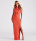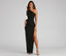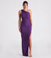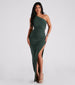 An elegant formal long dress that captivates! The Adora floor-length dress features a one-shoulder neckline. ruching throughout. a high side slit. and a wrap-styled silhouette. The dress is composed of a smooth knit fabric that offers a form-hugging fit with a moderate stretch. Complete look with rhinestone heels and a tennis bracelet.