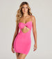 Adorable chic and ready to be seen. this sleeveless mini dress is everything! It features adjustable spaghetti straps for a customizable fit. a sweetheart neckline adorned with a statement bow. and a cutout bust to show a peak of skin along the bodycon silhouette. Complete the look in high heels.