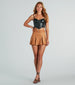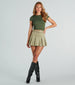 You'll always win adorable style in this faux suede mini skort! The high-rise adjustable belted waist provides a flattering fit. while the A-line pleated skirt overlay adds a touch of cuteness. With a mini-length hem and shorts lining. this faux suede skort offers the perfect style for any plans! Complete the look in a basic tee and boots.
