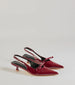 Adorable and chic. these sleek patent faux leather pumps feature a closed pointed toe. a bow accent strap. an adjustable sling-back strap. and a short kitten heel. Style with an oversized blazer.