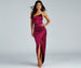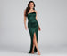 Get swept up in an elegant formal dress that captivates from the moment you enter the room! Adrienne features a one-shoulder neckline with two bungee straps leading to the sultry open-back. She showcases some leg in a high side slit along the wrap style skirt with ruching to enhance your curves. Complete look with rhinestone heels and a tennis bracelet.