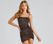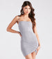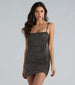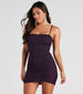 The party doesn't start till you sparkle in this glitter knit dress! The mini dress features a sleeveless square neckline. spaghetti straps. a ruched mini-length hem. and a bodycon silhouette. The knit-lined fabric offers a moderate stretch. Complete the look in lucite heels and a clutch.