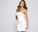 Hit up those after-parties with a wowing mini dress that creates a head-turning impression! The dress features a sleeveless square neckline. sleek bungee spaghetti straps. a ruched body. and a mini-length silhouette. The dress is composed of a double-lined buttery smooth fabric that offers a form-hugging fit with a moderate stretch. Complete look with a clutch and neon heels.Â