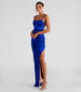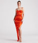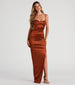 Sleek and stunning. the Alani satin formal dress is a chic go-to! She features a sleeveless cowl neckline. spaghetti straps. an alluring open back with a horizontal strap design. a high waist seam. ruching down the sides. and a fitted. floor-length silhouette with a thigh-high side slit. Style this dress with platform heels and a sleek clutch.