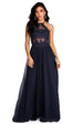 Own the night in ravishing red as you allure them all in our head turning Alessandra dress! She features an all over rich navy blue hue. a high square neckline with racer bust. padded cups and an open back to show off a hint of skin. Her sheer mesh bodice is partially lined and adorned with with floral appliques and rhinestones. Her sweeping double lined floor length silhouette is composed of an airy chiffon fabric. Alessandra offers a relaxed fit with minimal stretch and includes a hidden lower back zipper closure.