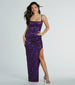 Dare to sparkle in the Alessia sequin satin formal dress at galas. prom. and fancy parties! Exquisitely crafted with countless sequins in a scroll pattern on luxurious satin fabric. this formal gown brings an enchanting presence. A sleeveless square neckline and adjustable spaghetti straps give you a flattering look. while the underbust seam creates an enhanced bust. Shine in the slim silhouette as the high side slit and long-length hem add a touch of elegance to your evening. Complete the look with a clutch and bracelets for a memorable evening out!