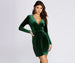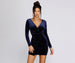 Get wrapped up in the heat of the moment! Our short and classy Alexa dress is perfect for your homecoming night with a wrap-like body. a daring V-neckline. and long sleeves. She has a wide waistband that accentuates your curves and a mini-length skirt. Alexa is composed of a soft velvet knit that offers a moderate stretch and has a vertical stripe pattern created by dazzling heat stones. She includes a back zipper closure. Complete look with rhinestone heels.