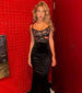 Create a gorgeously chic look for your formal affair in Aliana dress designed with a sheer lace bodice with a contrast nude-tone lining and a satin-knit floor-length mermaid silhouette. It features a sleeveless V-neckline. adjustable spaghetti straps for a customized fit. and dual waist cutouts for a sultry detail.