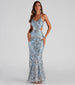 Bring the gorgeous sparkle to your special night out in the stunning and elevated Alice formal dress. She features a sleeveless V-neckline with a padded bust. spaghetti straps that lead to a lace-up back design for a customized fit. and chic side cutouts. Her high waist seam flows out to a floor-length. fitted. mermaid silhouette. The sheer mesh fabric features all-over sequin embroidery in a luxe scroll design and includes a full knit lining. Style this dress with rhinestone duster earrings.
