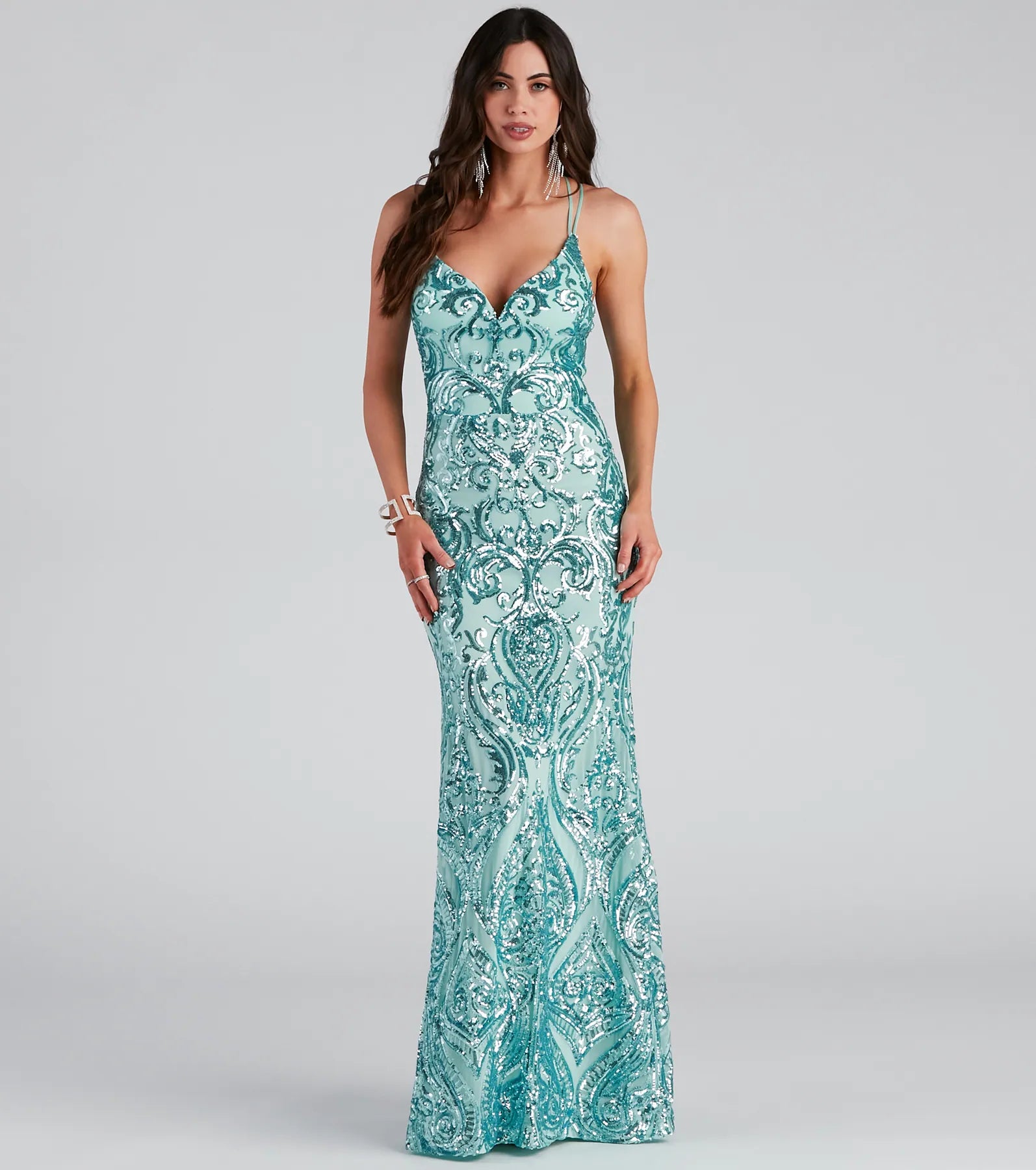 Enchant at the prom in the Aliyah formal sequin dress perfect for making a dazzling grand entrance. She features a sleeveless. v-neck. sleek adjustable straps. and a built-in padded bust. Her form-fitting bodice leads to an alluring open-back with strappy detail and zipper closure. Her floor-length mermaid silhouette is designed to flatter every figure. The formal dress is composed of a sequin embroidered fabric with an inner lining and no stretch. Complete the look with a chic clutch.