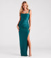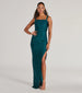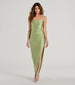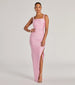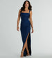 Make them all do a double-take as you make a glam entrance in the gorgeous Aliza formal dress! She features a sleeveless square neckline. thin tank shoulder straps. an alluring backless design with lower tie-back straps in a chic bow accent. ruching down the side seams. a floor-length hem with a thigh-high side slit to showcase some leg. and a slim-fit silhouette to highlight your figure. The smooth knit fabric offers plenty of stretch. Complete your Prom look with sparkling rhinestone-embellished heels.