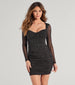 You're all about that glitz and glamour. so this glitter mesh mini dress is perf for your next night out. It features a sweetheart neckline. sheer long fitted sleeves. ruched seams to accentuate your curves. and a short bodycon silhouette to flaunt your stunning figure.