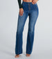 A pair of denim jeans that effortlessly hug your curves for the perfect silhouette! Your new favorite jeans feature a flattering high-rise waist. front seam detailing down the front. a hip-hugging fit. and a raw flared hem. Crafted on dark wash denim fabric. they offer a slight stretch and a vintage-inspired color fading. Complete the look in a bodysuit for day or night plans!