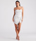 This stunning glitter knit mini dress will have you showcasing glitz and glamour all night long! It features a sleeveless square neckline. spaghetti straps. a faux wrap-front skirt with an asymmetrical hem and a rhinestone embellished trim. and a short. curve-hugging silhouette. The glitter knit fabric offers a moderate stretch. Style this mini dress with platform heels.
