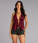 Designed to shine. this halter crop shows off a daring plunge and open back. finished with rhinestones that catch the light.