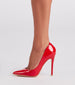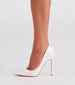 Classy and chic. these faux leather pumps were made for you! They feature a closed pointed-toe. one open cutout side and one closed side. a stiletto heel. and a closed ankle. Style with a posh tweed matching set for afternoon tea.