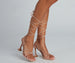 Bring glamour to your look with heels that elevate your outfit. The heels feature an open back. lace-up ties. an open square toe. a multi-strap caged design with a knot accent. and a stiletto heel. The heels are composed of a faux leather material. Complete look with a blouse and midi skirt.