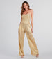 This metallic strapless jumpsuit is an eye-catching and sophisticated statement. Featuring a strapless sweetheart neckline. knot bust accent. wide-leg silhouette. and metallic pleated fabric. it's the perfect outfit for stylishly turning heads. Complete the look in platform heels.