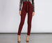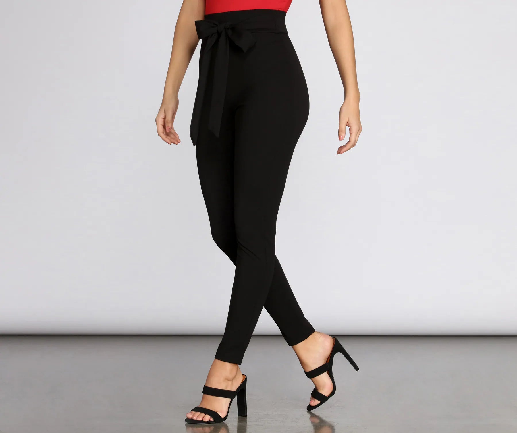 Stun in classically chic dress pants. Perfect for expanding your workwear outfits. throw on high waist pants that feature a cinching tie waist belt and a skinny leg fit with a tapered hem. The pants are composed of a crepe twill fabric that offers a form hugging fit with plenty of stretch to easily move around. Complete your classy look with a blouse or keep it casual with a minimal basic knit top.