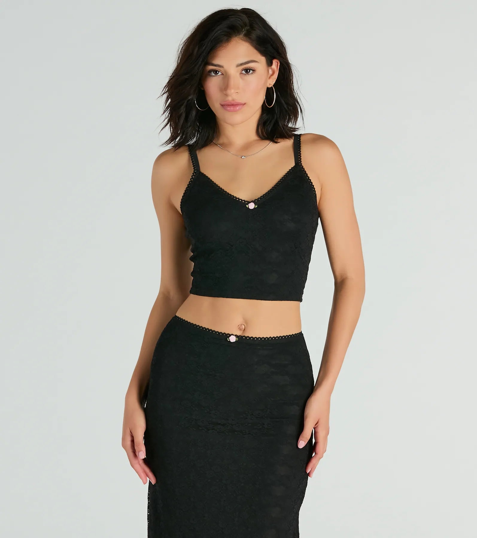 You'll captivate everyone in this alluring lace crop top for an effortless dreamy look at dinner!  With a sexy V-neckline and delicate spaghetti straps. this lace crop top features a rosette flower and fitted hem. Complete the look with the matching bottoms.