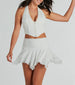 Alluring and flirty! Unveil this lace mini skort for a romantic look on your next date. The high-rise waist and uneven mini-length hanky hem create a sultry silhouette. while the stretchy knit shorts lining provides comfort and coverage. Complete the look in a mesh bodysuit and strappy sandals for an unforgettable outfit!