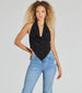 Add some allure to your night-out look with this flocked leopard print knit top featuring a halter cowl neckline. a bold open back with a lower tie-back design. and an asymmetric hanky hem. Perf for pairing with high-rise jeans and heels!