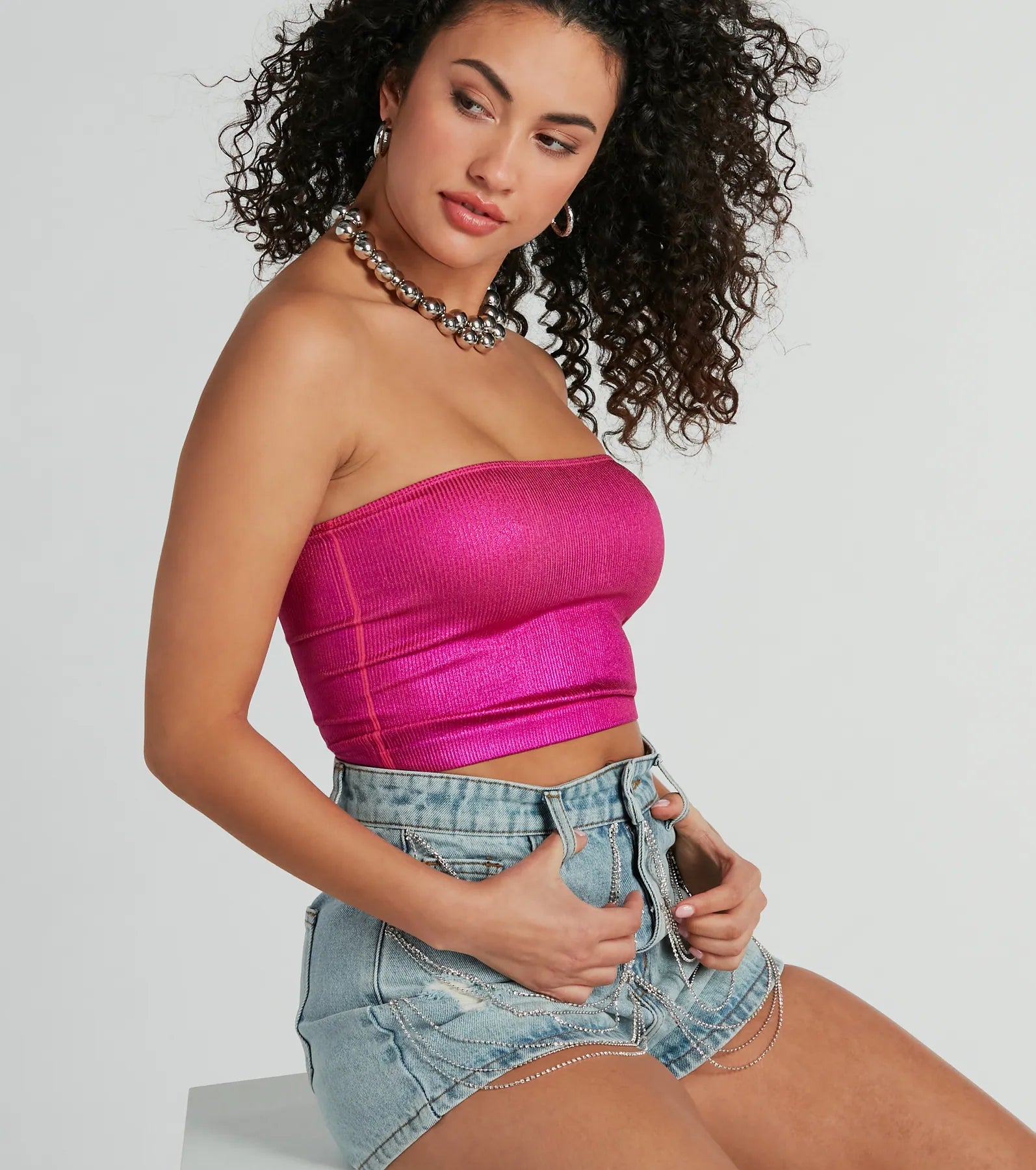 Showcase an alluring sheen in this metallic bandeau bra. perf for styling by itself or under your fave sheer tops! This bra is made with a stretchy ribbed knit fabric for a comfortable. form-hugging fit. The metallic finish gives that touch of trendy glamour. The bra features a strapless straight-across neckline and a cropped hem for a snatched look. Pair with denim shorts and a faux leather jacket for a concert!